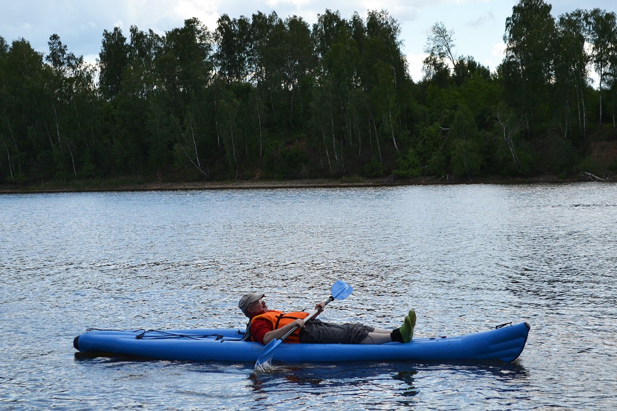Пробовали килять его специально. Киляешся, переворачиваешь надувной каяк Лагуна назад и забираешься на него с носа или кормы — всё. Даже воду сливать не нужно...